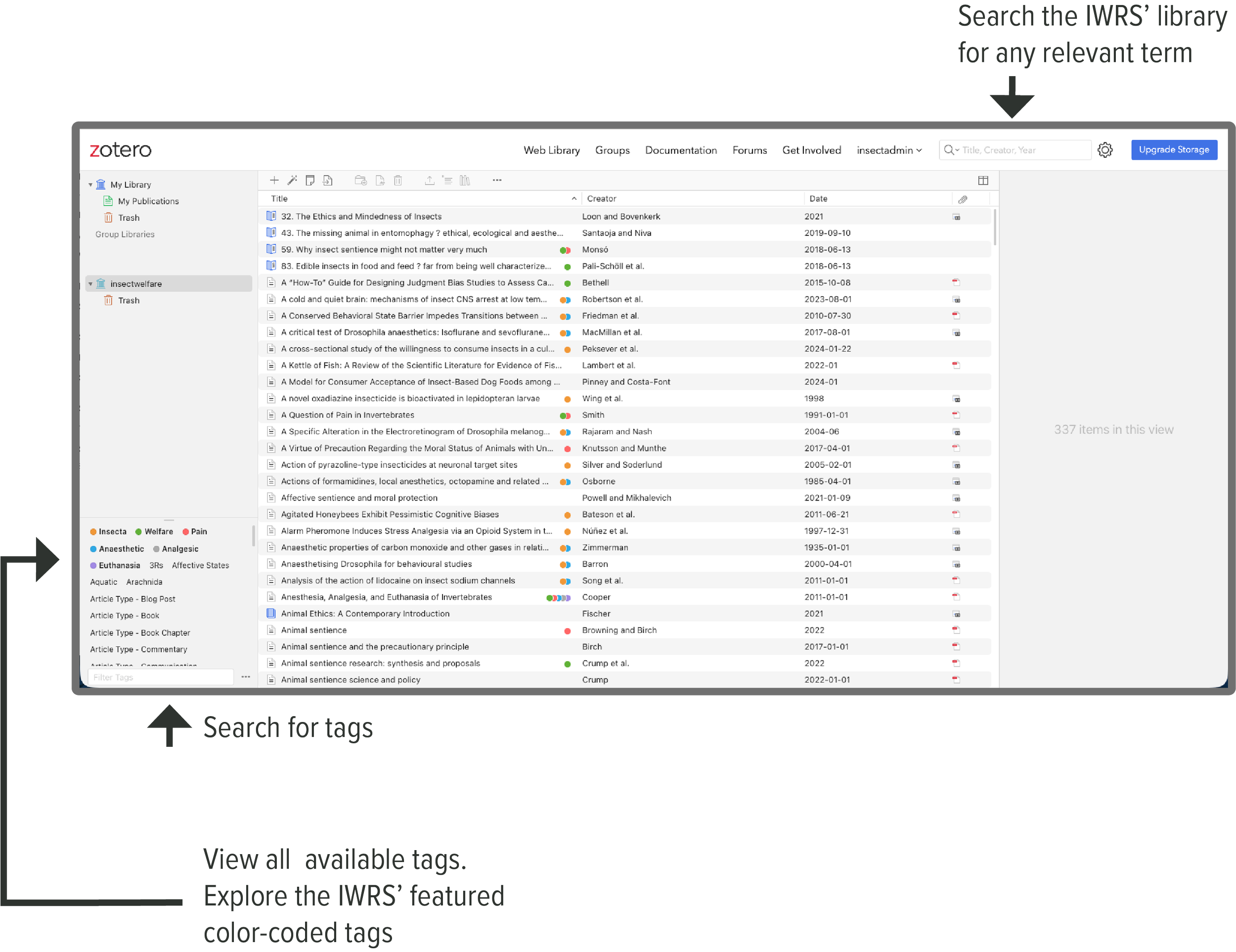 The IWRS has compiled a research library with a wide range of resources on the welfare of insects and other neglected species. It includes both conceptual work and primary scientific research. These resources are hosted in Zotero — see below for tips on how to navigate and use the library.